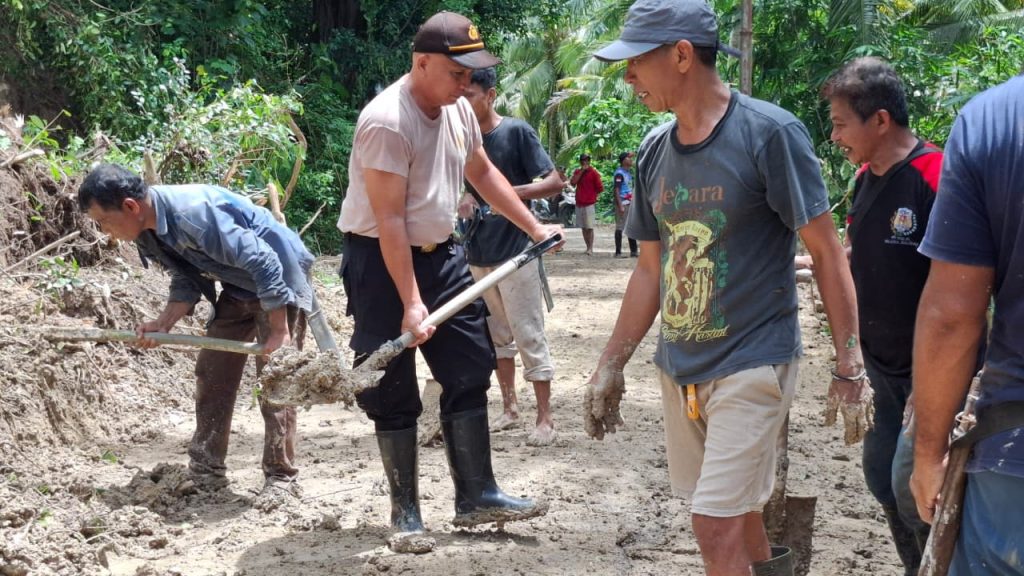Kapolsek Balantak bersama anggotanya bergotong royong membantu membersihkan material longsor.