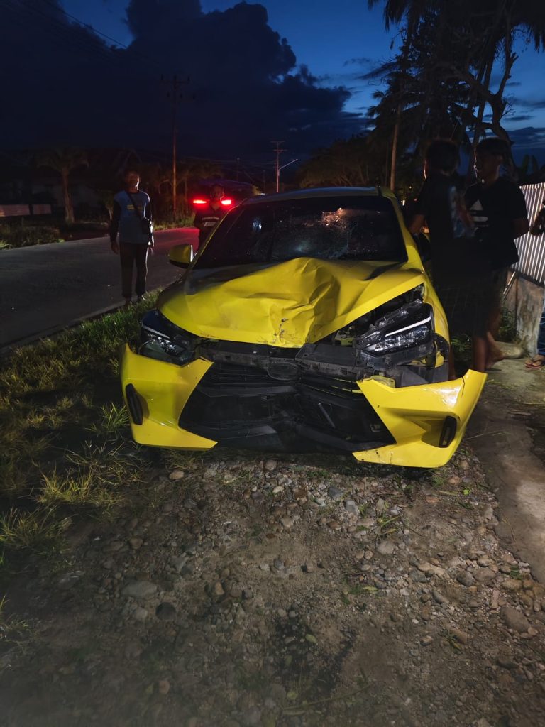 Mobil yang menabrak mengalami kerusakan pada bemper, kap depan, serta kaca depan yang pecah.