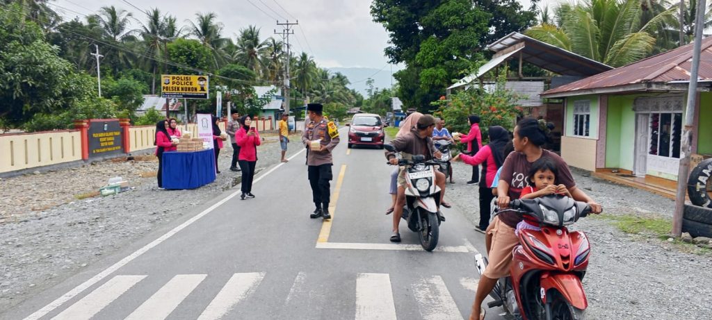 Pembagian takjil dilaksanakan di depan Mako Polsek Nuhon dengan melibatkan personel kepolisian serta anggota Bhayangkari yang turut turun langsung ke jalan.